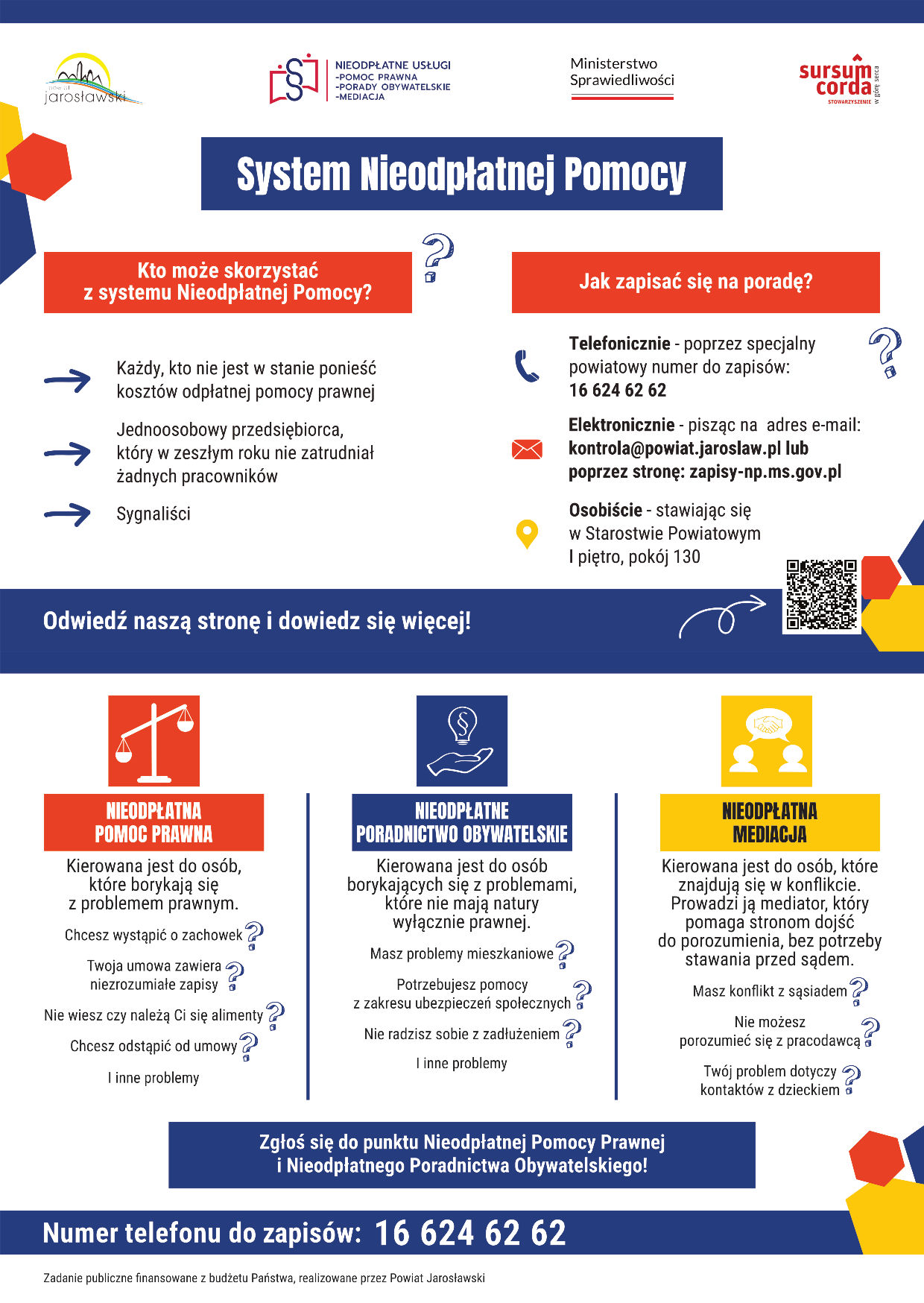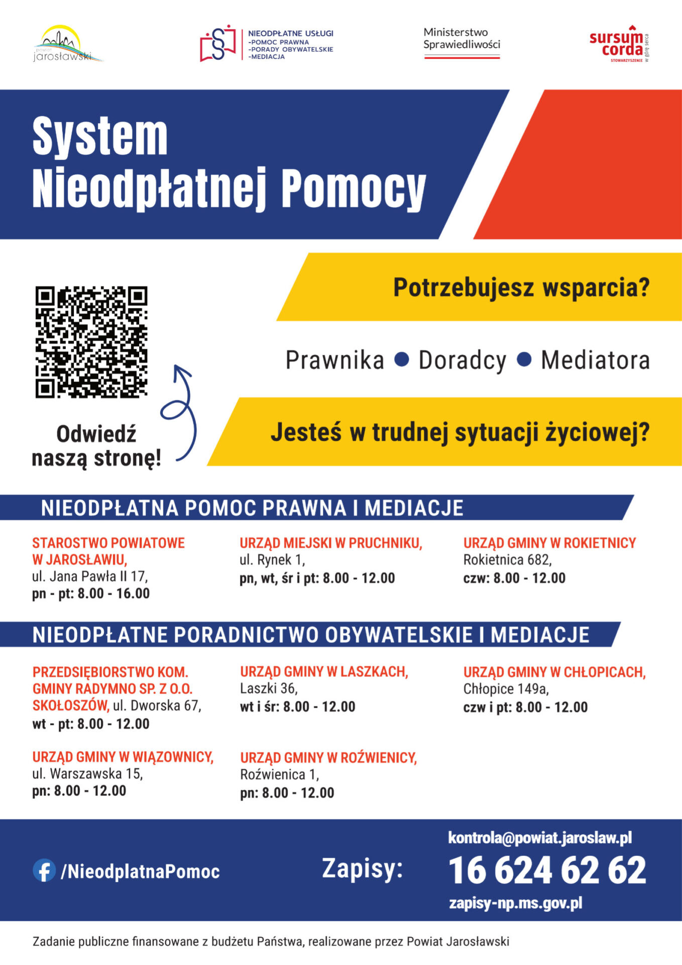 Jeśli szukasz pomocy lub wsparcia prawnego w trudnej sprawie lub nie stać Cię na skorzystanie z usług kancelarii prawnej i nie masz się do kogo zwrócić o pomoc, zapraszamy do skorzystania z punktów nieodpłatnej pomocy prawnej i poradnictwa obywatelskiego na terenie powiatu jarosławskiego.